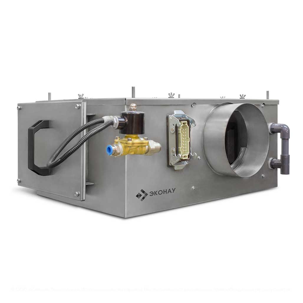 Воздух из вентиляционного канала подается в корпус увлажнителя и проходит через постоянно смачиваемую водой мембрану (картридж). В результате влага на поверхности мембраны испаряется, а воздух увлажняется и охлаждается. После этого увлажненный воздух поступает в целевое помещение. Датчик влажности измеряет влажность в помещении и передает полученные данные в шкаф управления. Шкаф управления автоматически регулирует работу увлажнителя для поддержания оптимальной влажности в помещении. Все модели данной серии изготавливаются под заказ, исходя из параметров системы вентиляции на предприятии заказчика. При изготовлении учитываются: форма сечения вентиляционного канала (круглый, прямоугольный, квадратный), размер вентиляционного канала, тип присоединительного фланца. Конструкция корпуса позволяет производить обслуживание и ремонт увлажнителя по месту установки, без необходимости его демонтажа. Увлажнитель оснащен выносным шкафом управления, при помощи которого осуществляется включение/выключение и настройка увлажнителя. Увлажнитель разработан и произведен в России по техническим условиям ТУ 28.25.14-002-43090350-2020. Регистрационный номер декларации о соответствии: ЕАЭС N RU Д-RU.РА02.В.27386/21.